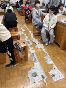 その後、縦割り班になり、アイスブレイクとして、班対抗で新聞紙ちぎりゲームを行いました。
