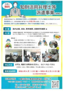 青森県発明協会では、知的財産の活用による事業展開子どもの創造力を育成するための知財教育などに、知的財産権の専門家である弁理士を派遣しています。知的財産に関する企業の課題解決学校での知財講座の実施に、ぜひご利用ください。